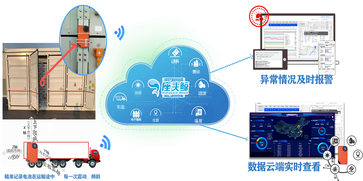 在運輸過程中儲能電池必須捆緊并碼好,應避免劇烈振動、沖擊或者擠壓,進行包裝后再運輸。過度的運輸振動除造成儲能電池安全隱患外,也會影響其性能,如壽命縮減以及容量降低。振動環境主要對鋰離子電池隔膜在電解液中的浸潤性影響較大,同時也可能使得電極材料與集流體之間的結合力下降。受振動影響電芯內正、負極片在電解液中的浸潤度發生變化,使得離子導電性減弱,造成容量衰減。座頭鯨方案通過對振動加速度以及沖擊加速度的監控,輔以溫濕度監控,有效保證電池品質與安全。